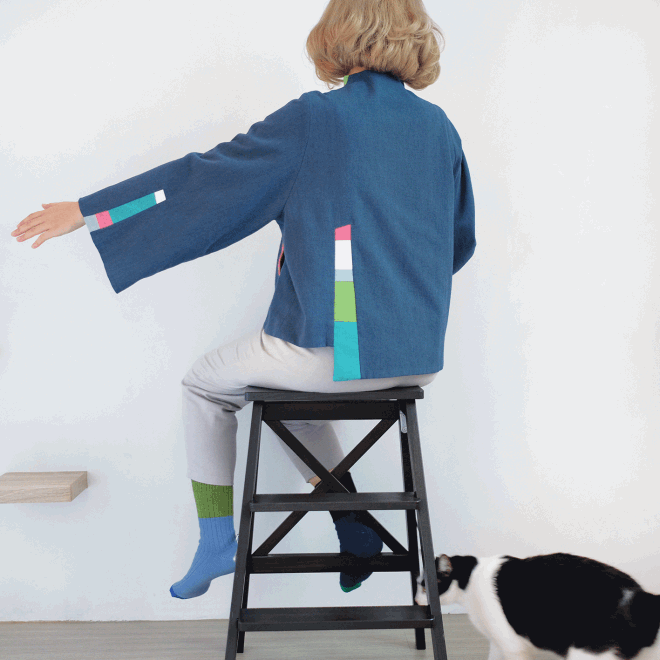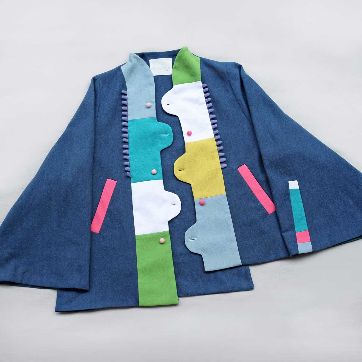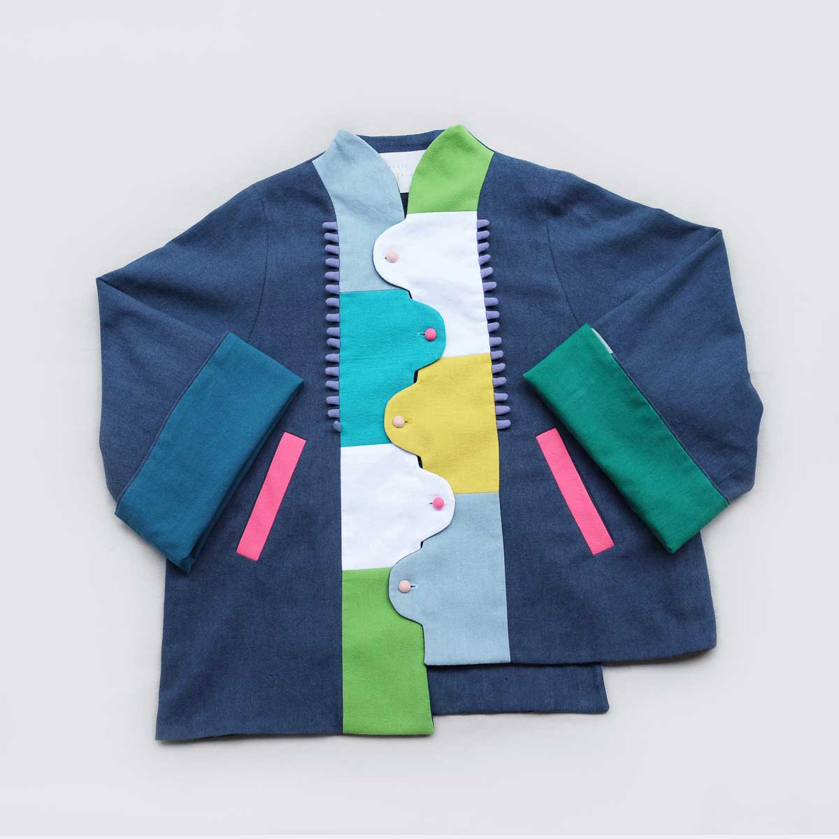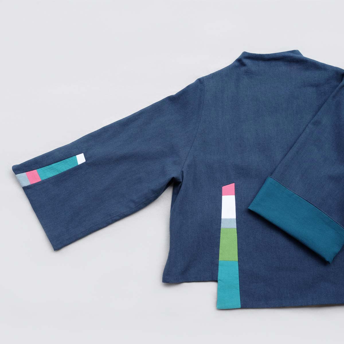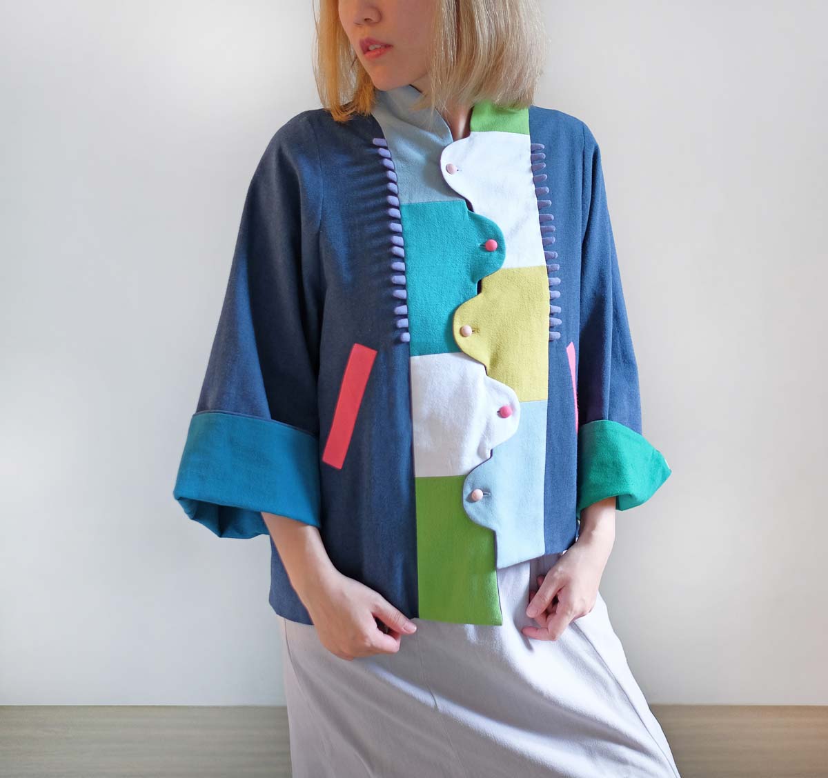 左扣右扣拼接秋冬外套 – 湖水藍 短版